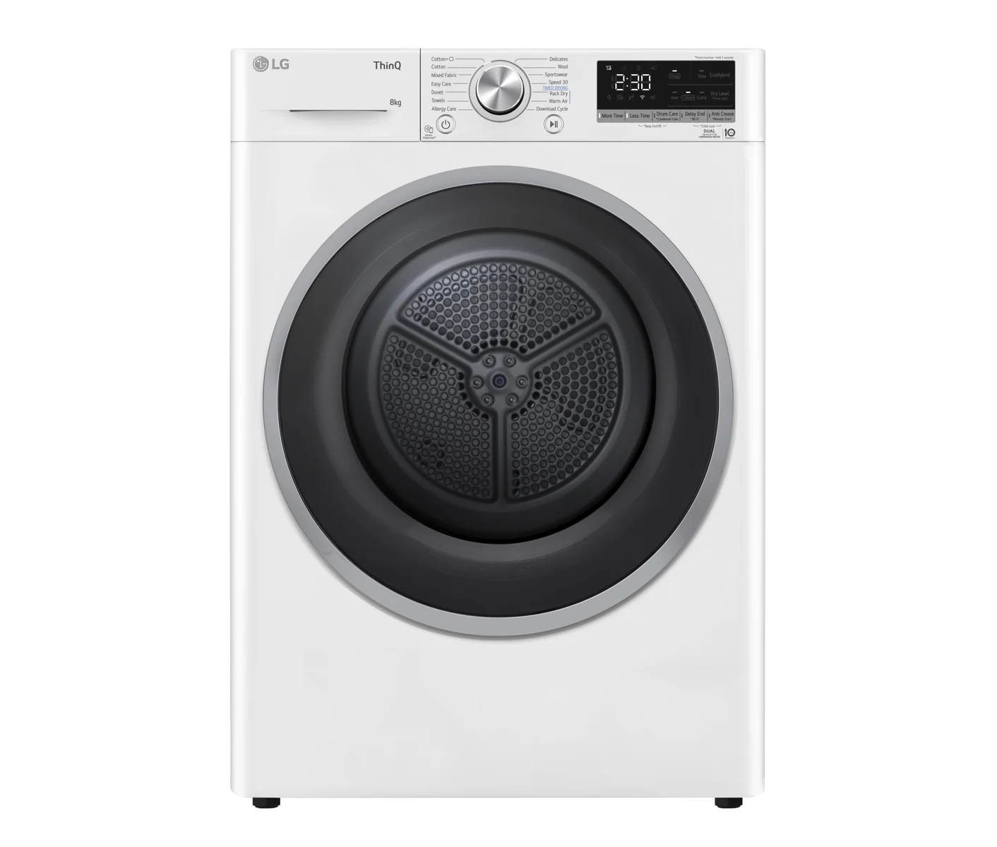 Funktioner: Auto rensende kondensator, Eco Hybrid™, Dual Inverter Heat Pump™, ThinQ Wi-Fi, Allergy Care program, vendbar dør